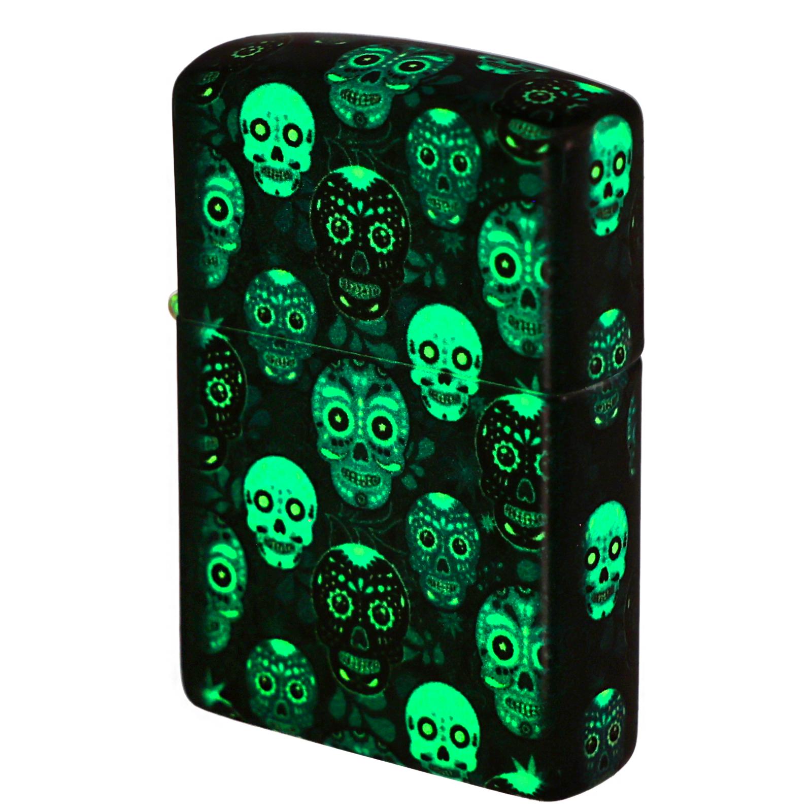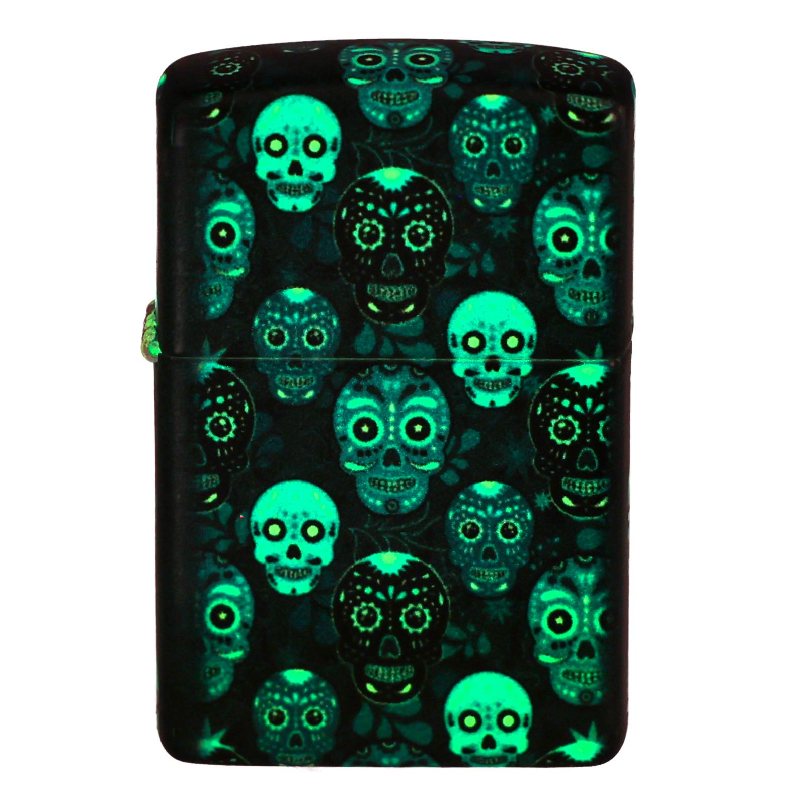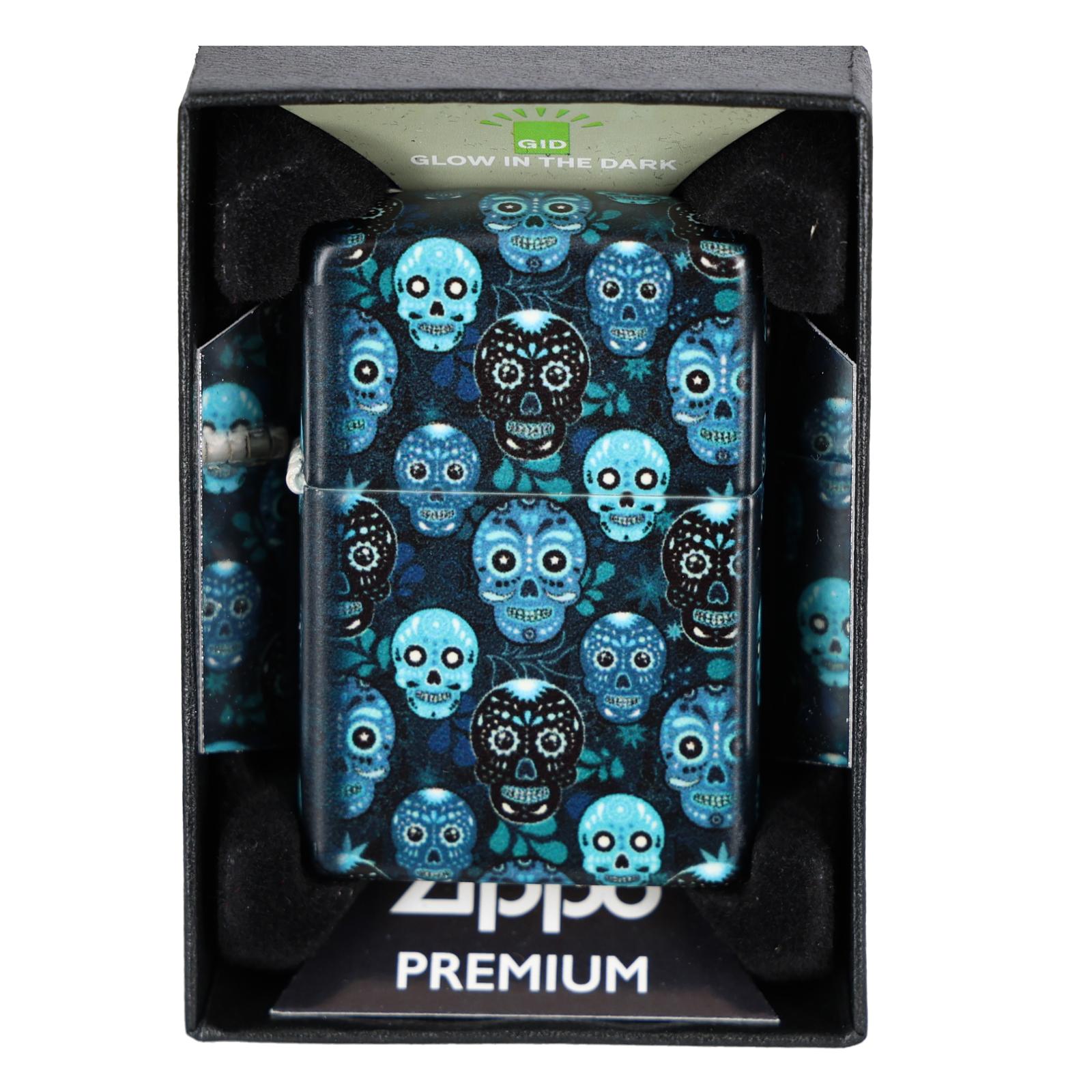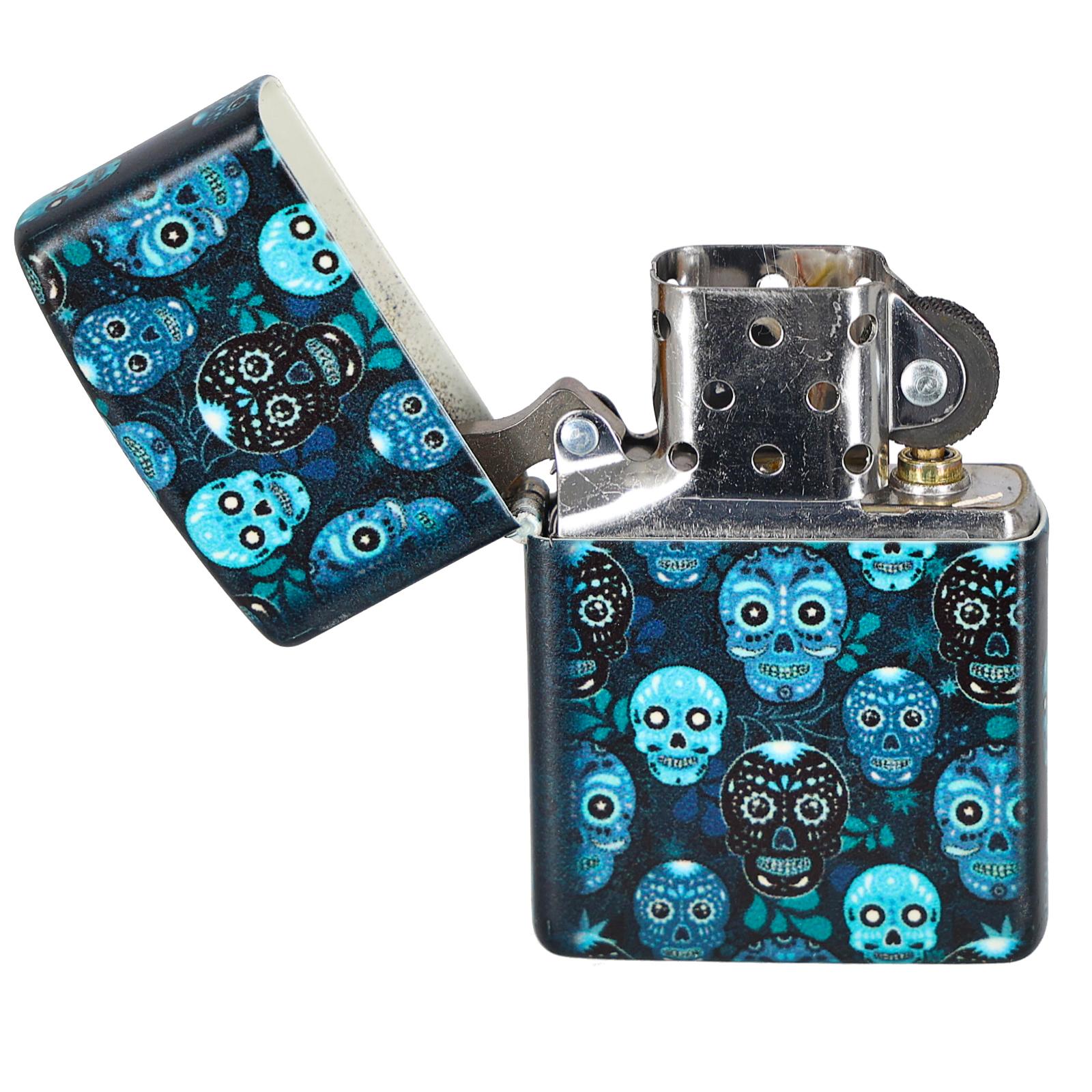 1Zippo 46017 „Sugar Skulls Design” to model z wyrazistym, artystycznym motywem — na obudowie znajdują się stylizowane „cukrowe czaszki” (sugar skulls), nawiązujące do tradycji artystycznych związanych z tzw. Día de los Muertos.