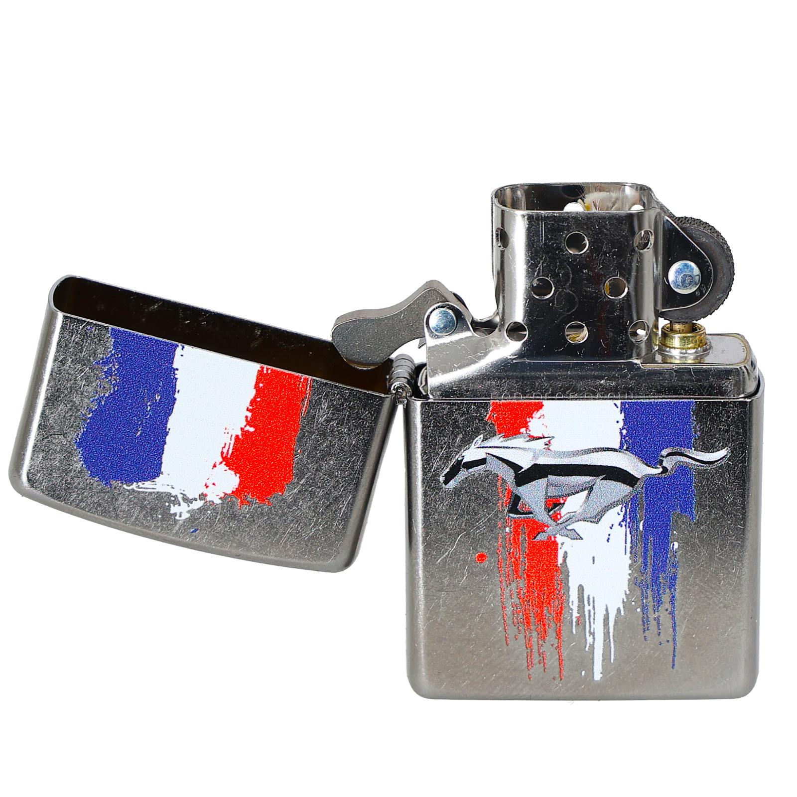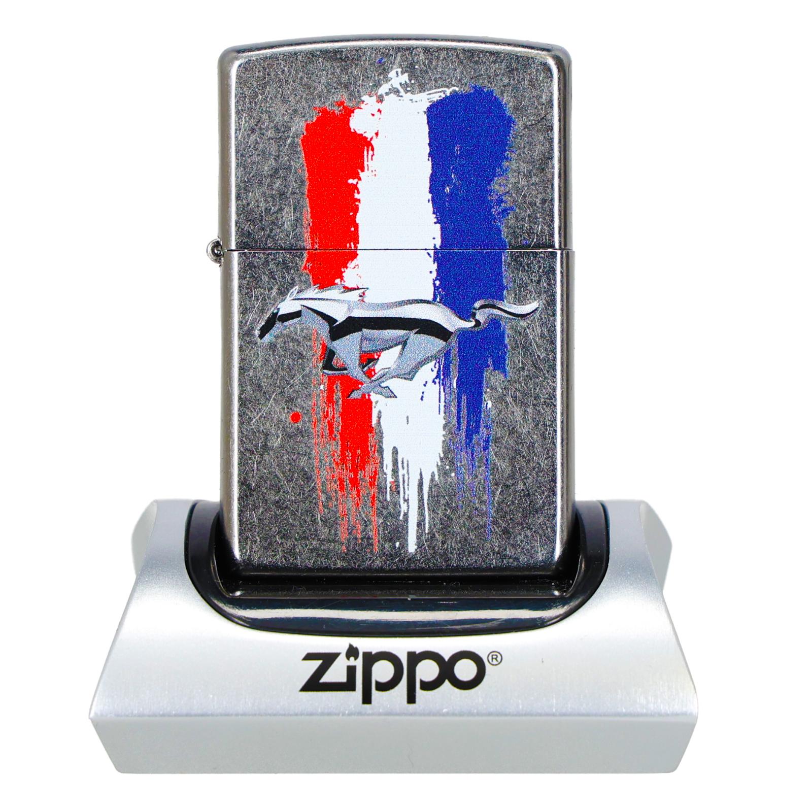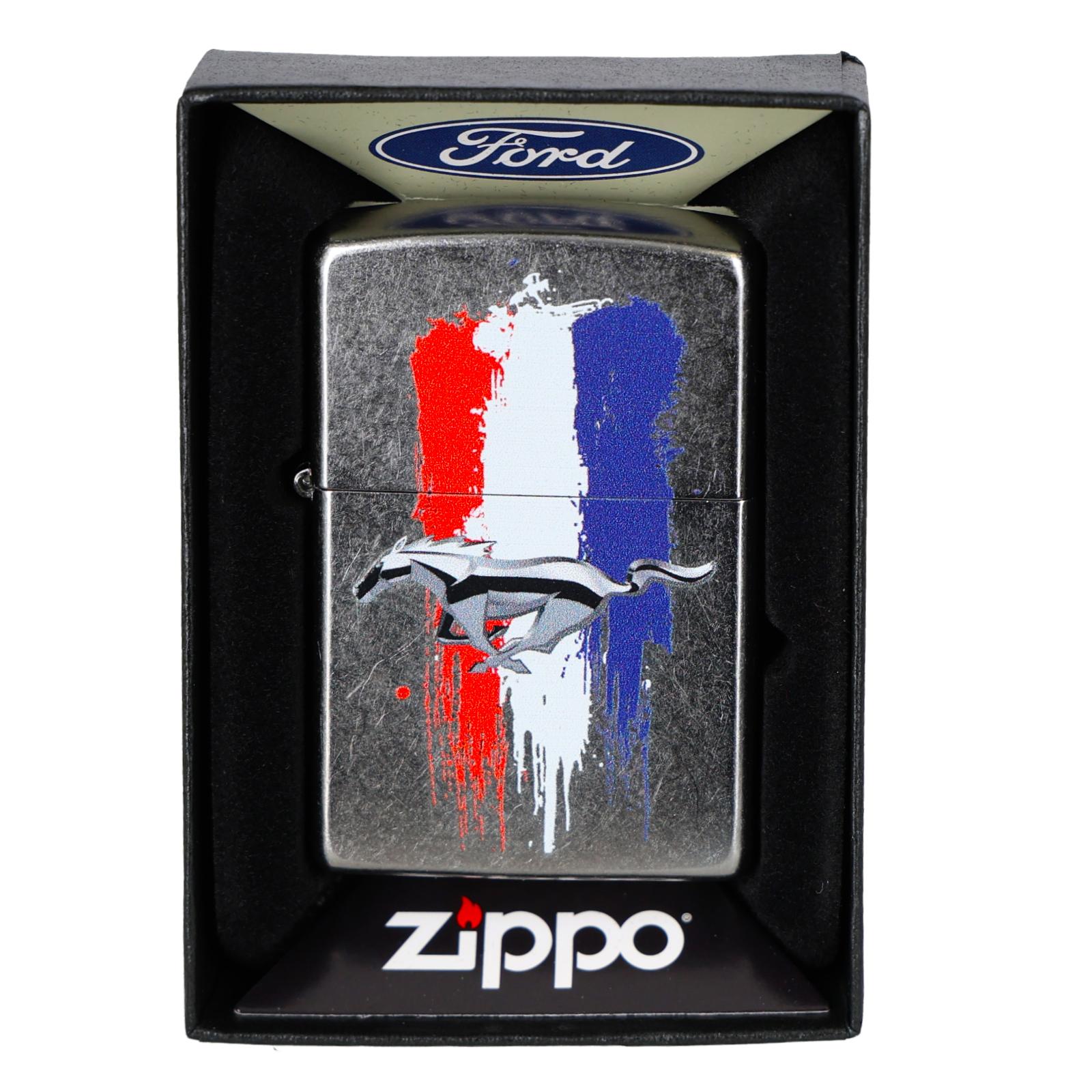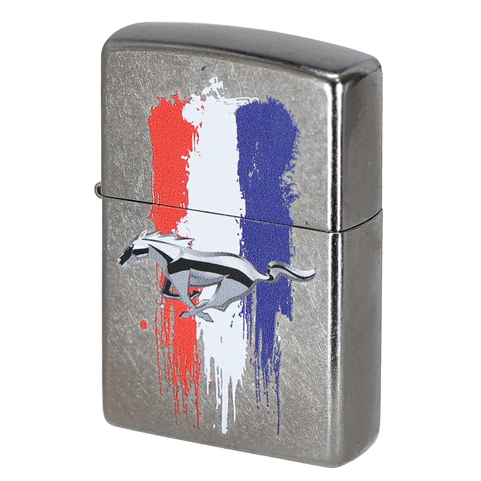 1Zippo 46221 to zapalniczka z motywem motoryzacyjnym: na obudowie znajduje się logo Ford Mustang, z charakterystycznym symbolem konia oraz z akcentami w postaci czerwono-białych-niebieskich pasów na tle chromowanego metalu — ukłon w stronę ducha amerykańskich aut.