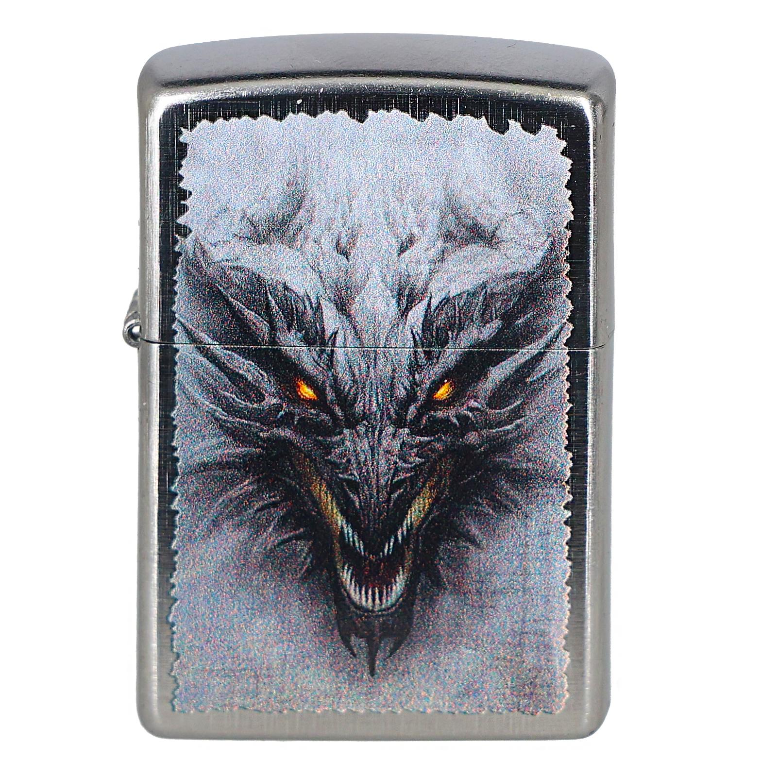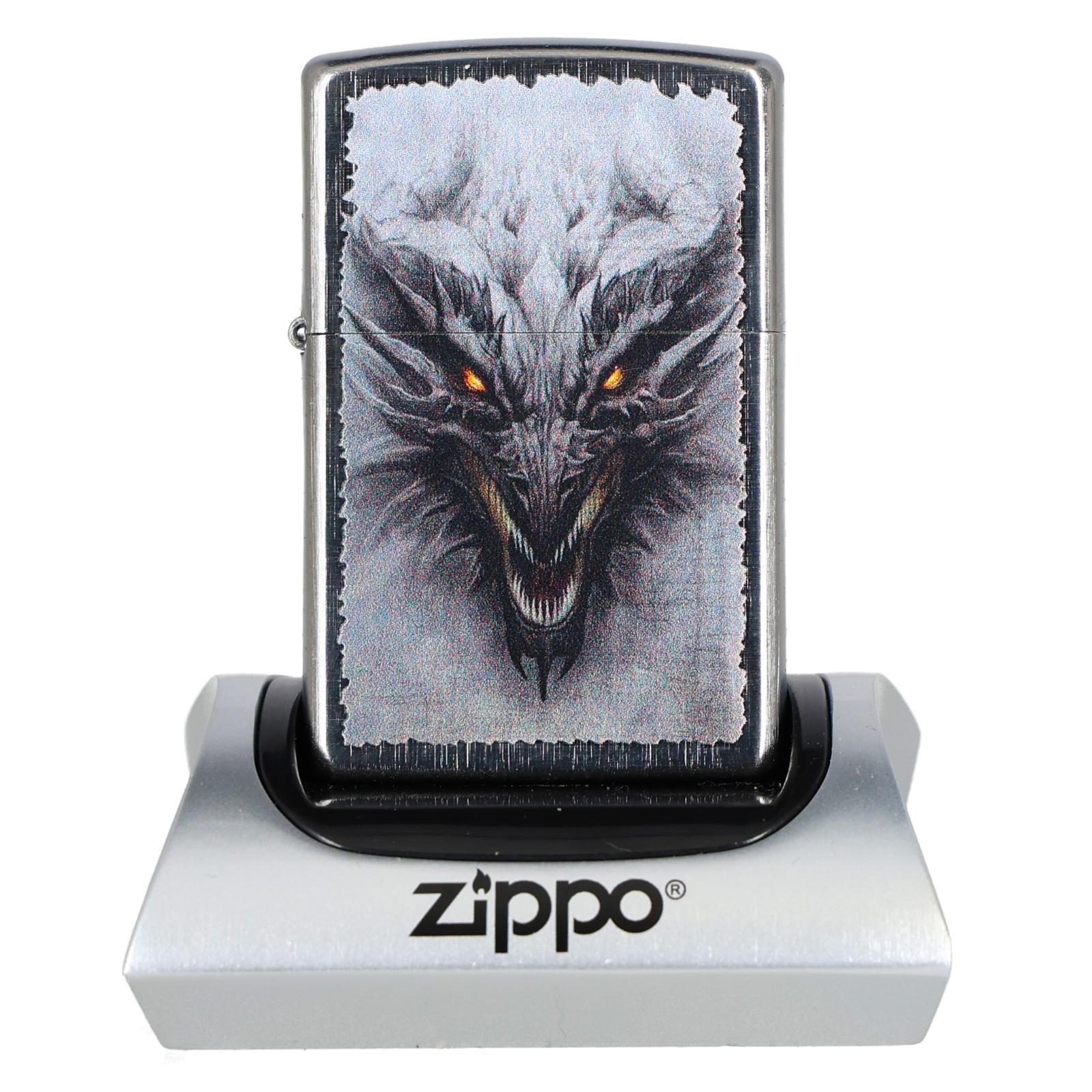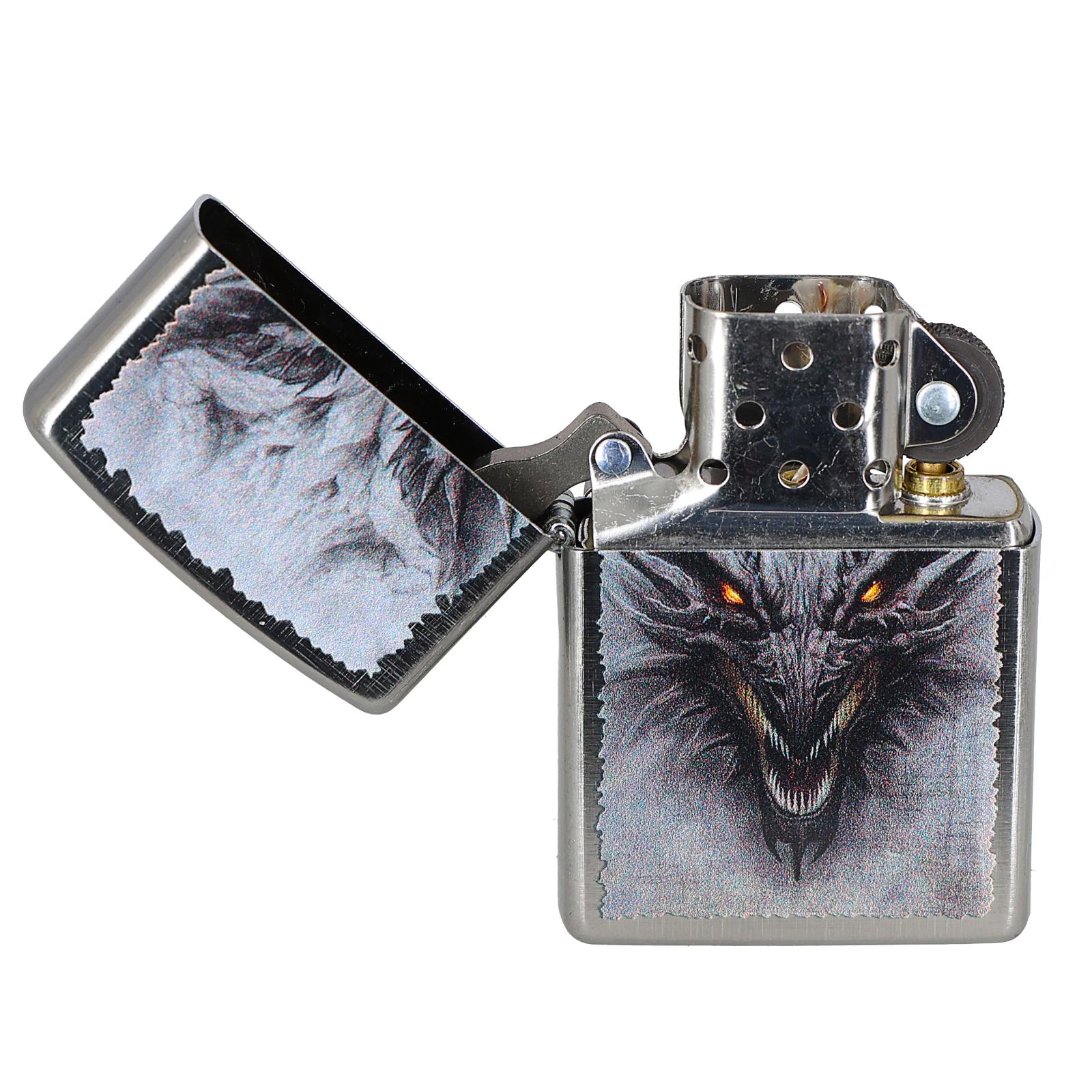 1Zippo 48732 to egzemplarz ozdobiony graficznie — na obudowie znajduje się wyrazisty motyw smoka: szczegółowy, dynamiczny — z agresywnym wyrazem, który ma przykuwać uwagę i nadawać „charakter”.