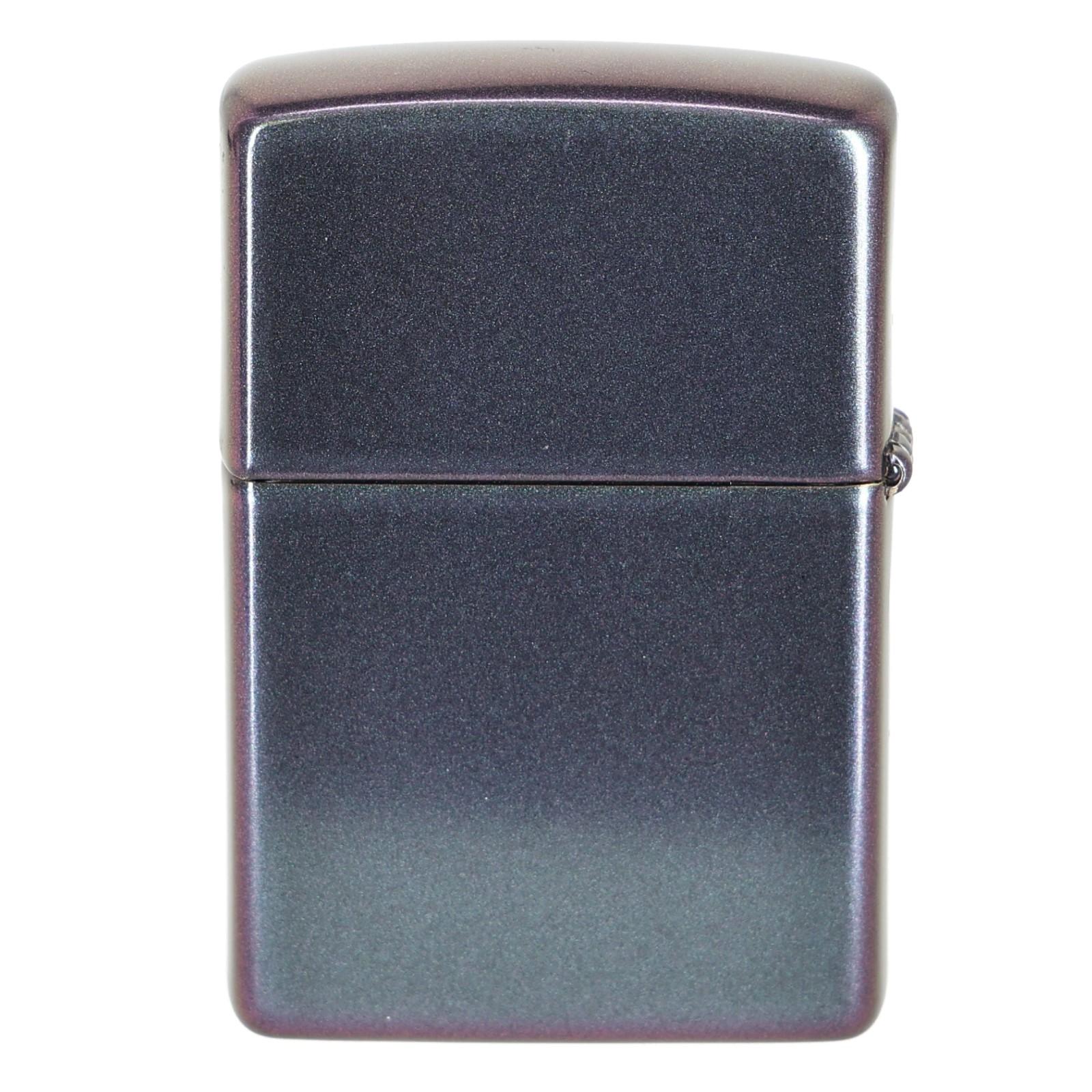 1Zippo 49146 ma unikalne wykończenie „Iridescent Matte” — czyli satynowo-matowy, opalizujący lakier, który zmienia barwy w zależności od kąta padania światła — dominują turkusowe i fioletowe odcienie ombre. Ta gra kolorów czyni zapalniczkę efektowną i niebanalną.