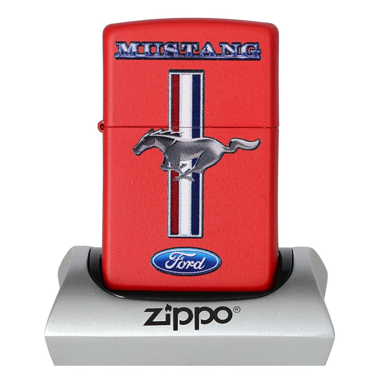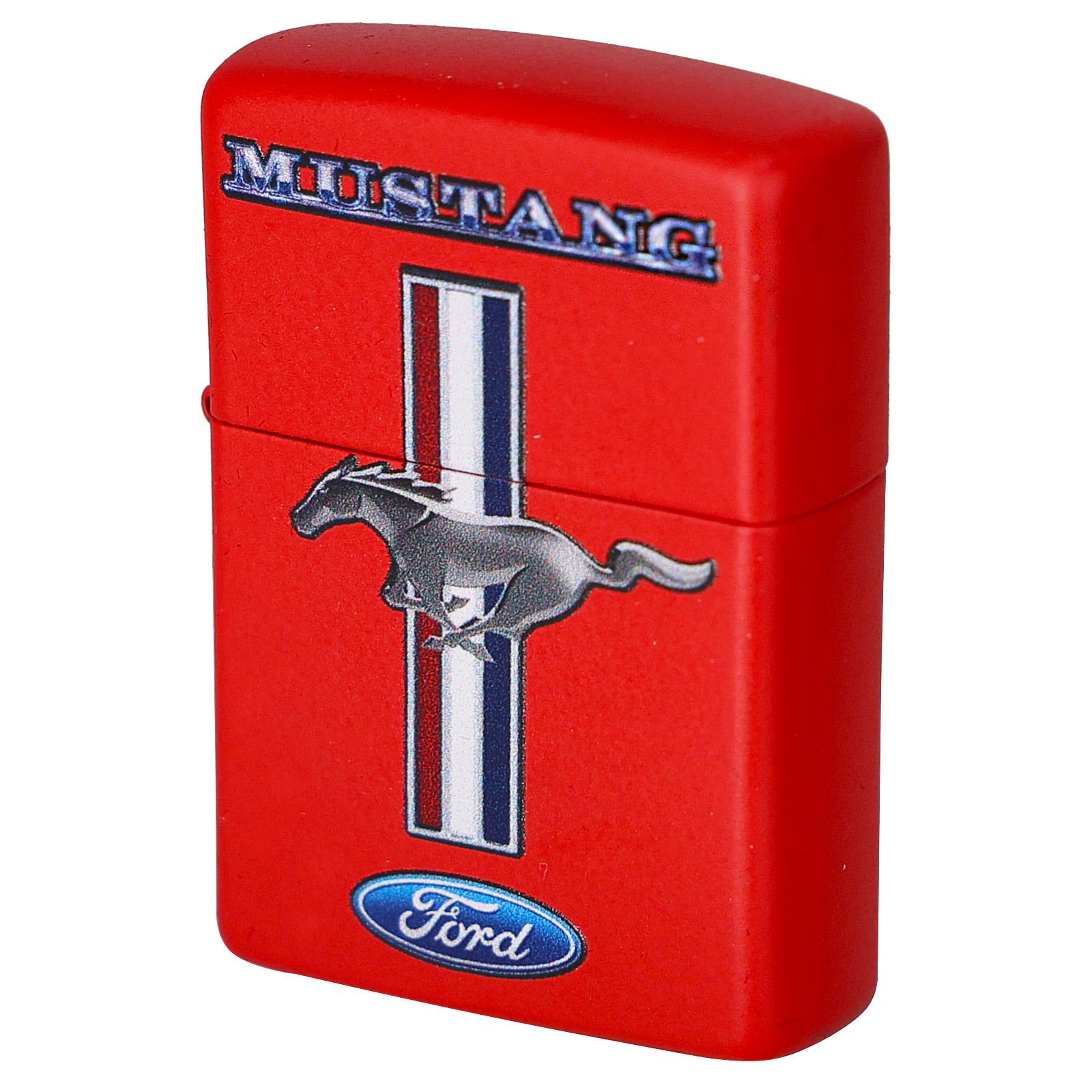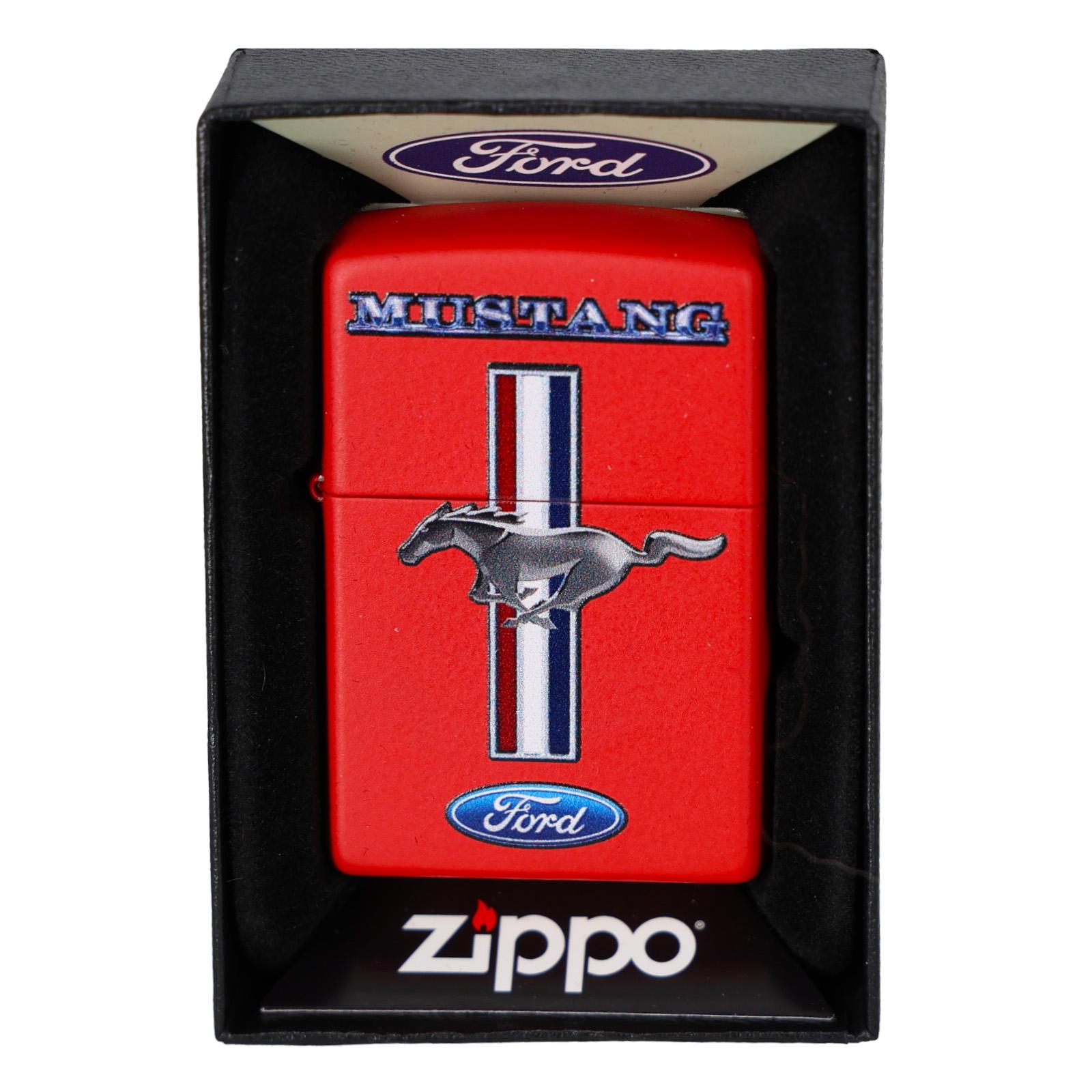 Zapalniczka benzynowa marki Zippo o modelu 60003580, dedykowana fanom motoryzacji i kultowego Ford Mustang. Obudowa w intensywnej czerwieni („Red Matte”) ozdobiona emblematem mustanga i stylową grafiką „Horse & Bars”.