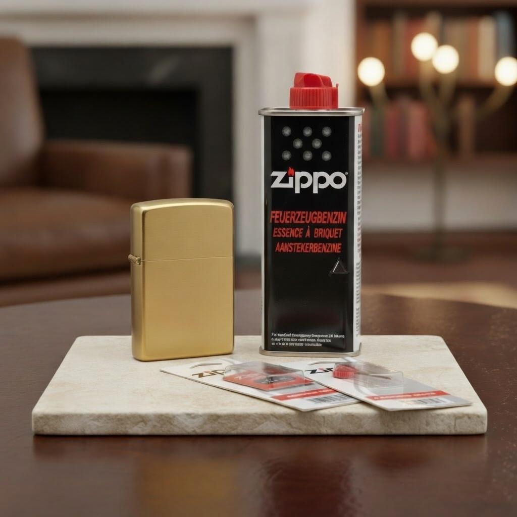 to legendarny klasyk marki Zippo w eleganckim wydaniu Brushed Brass, a jednocześnie kompletny pakiet akcesoriów, dzięki któremu zapalniczka jest gotowa do użycia od pierwszego dnia — bez konieczności oddzielnych zakupów części eksploatacyjnych.